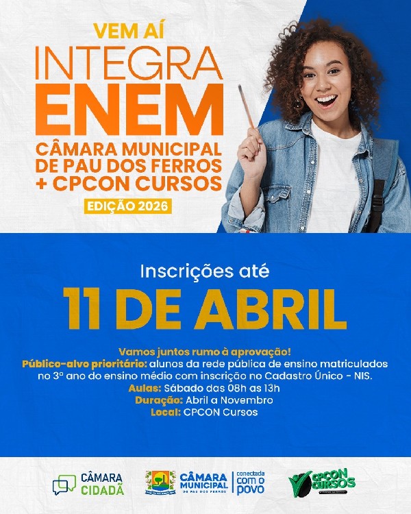 Os estudantes de Pau dos Ferros que desejam se preparar para o Exame Nacional do Ensino Médio (ENEM) têm nova oportunidade de aulas e materiais gratuitos neste ano, organizadas pela Câmara Municipal conjuntamente com a Escola da Assembleia Legislativa do Rio Grande do Norte (EALRN).